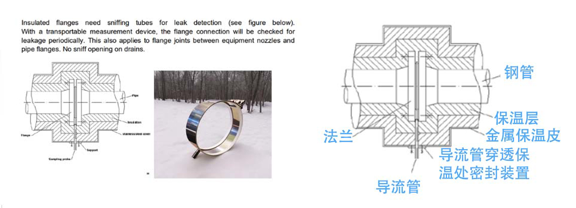 采用密封帶四氟或者石墨帶式或者殼式對保溫管道法蘭 閥門等泄漏進(jìn)行密封引流,成本簡單,保護(hù)環(huán)境和工人免受偶爾保溫發(fā)生的泄漏的影響,尤其是泄漏對管道腐蝕影響。當(dāng)法蘭和檢測裝置(嗅探管)之間發(fā)生泄漏時(shí),嗅探管將收集并傳導(dǎo)氣體。當(dāng)法蘭之間發(fā)生泄漏時(shí),氣體會(huì)立即通過嗅探管被導(dǎo)入,從而方便測量設(shè)備的使用。法蘭帶還能防止雨水水滲入法蘭之間的區(qū)域。